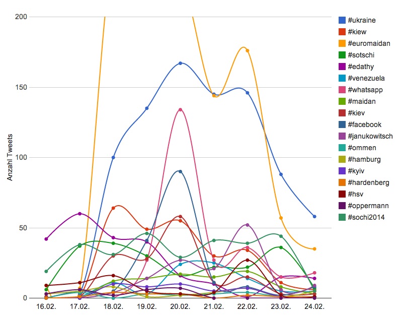 Sind die Daten erst einmal vorhanden, lassen sich daraus auch weitere interessante Erkenntnisse ableiten. So haben wir für heute mal eben innerhalb von wenigen Minuten herausgesucht, wie Journalisten über die Ukraine berichtet haben. Die nebenstehende Grafik zeigt die Aktivitäten und ihre Spitzen seit Anfang Dezember. Daraus die einfache Erkenntnis: Die Aufmerksamkeit ist stark abnehmend, wenn länger keine entscheidende Wendung geschieht. Dreimal fanden wir Deutschen die Entwicklung in der Ukraine richtig spannend. Dazwischen eher nicht.
